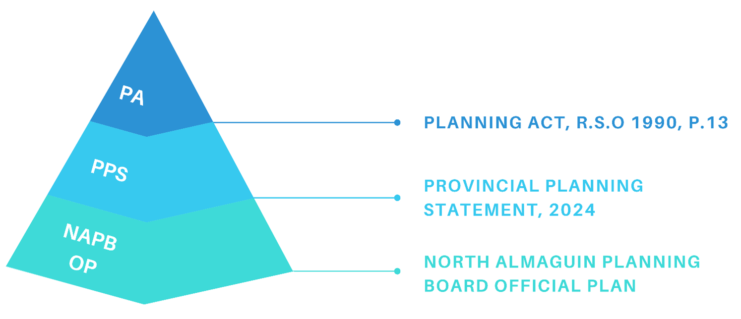 Land use planning is undertaken under the authority of the Province of Ontario. The hierarchy and land use planning in Ontario is illustrated below: